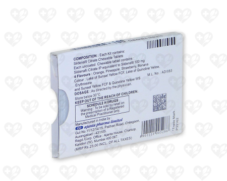 カマグラチュアブルの各タブレットには、100 mgのシルデナフィルクエン酸塩が含まれています。推奨される用量は、計画された性行為の約30分から1時間前に1つのチュアブルタブレット(100 mg)です。タブレットは飲む前に十分に噛んでください。
